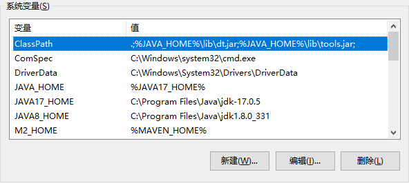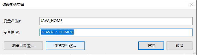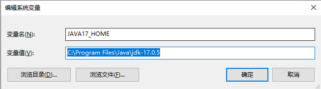 在系统变量里面,点击新建变量名:JAVA17_HOME,变量值:JDK17的安装路径,点击确认。