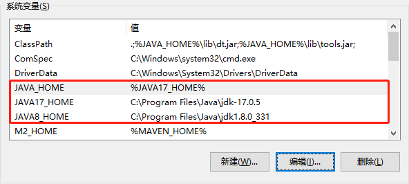 在系统变量里面,点击新建变量名:JAVA_HOME,变量值:JAVA17_HOME,点击确认,意味着使用的JDK版本是JDK17。